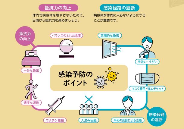 バランスのよい食事、適度な運動、十分な睡眠をとり、免疫力を高めましょう。 - 予防接種を受ける