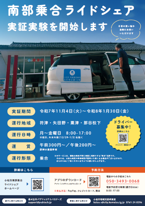 このため,符津,矢田野,粟津,那谷校下において,自家用有償旅客運送を乗合方式で行う“乗合ライドシェア”により,交通空白を解消することを目指すものであり,持続可能な交通手段となり得るのか各種検証・評価を目的に実証実験を行うものです。