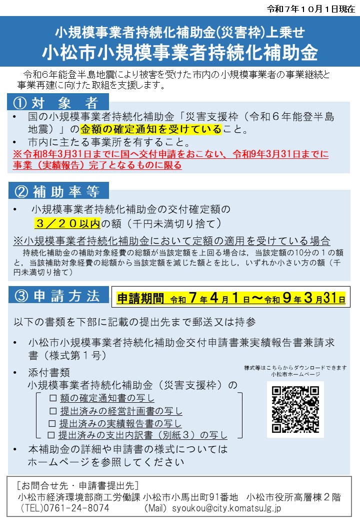 令和6年能登半島地震により被害を受けた市内の小規模事業者等の事業継続に向けた復旧費用の事業者負担を減らし,速やかな事業活動の再開を目的として,国の「小規模事業者持続化補助金(災害支援枠)(令和6年能登半島地震))」に対して,上乗せの支援を実施します。