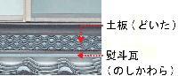 雨水の浸透を防ぐために、2階の壁面と1階の屋根の収まりには、「前包み(まえづつみ)」と「熨斗(のし)」が施され、瓦材を用いたものをそれぞれ、「土板(どいた)」、「熨斗瓦(のしかわら)」という。 |