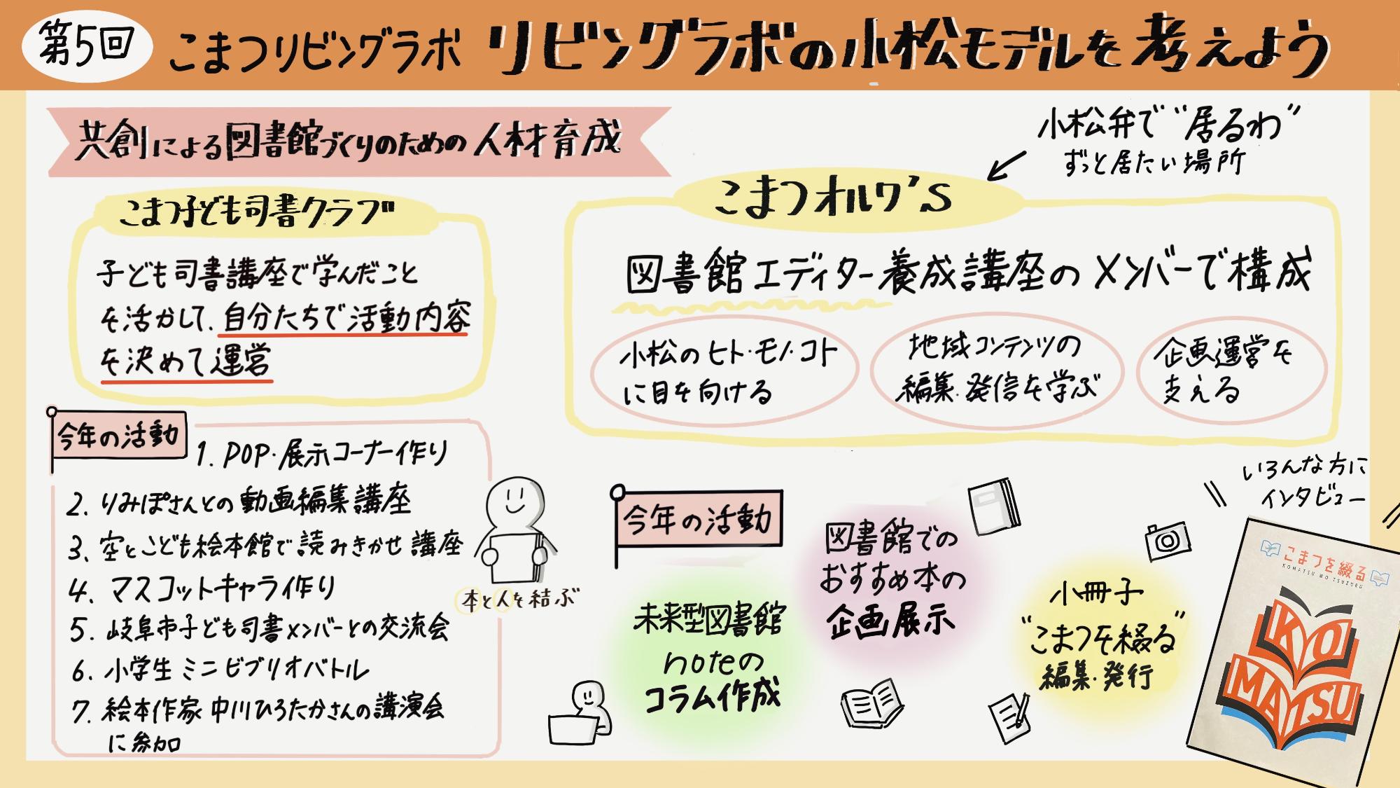 下記の画像は、第5回こまつリビングラボの参加者の方がまとめてくださった「グラフィックレコーディング」です!