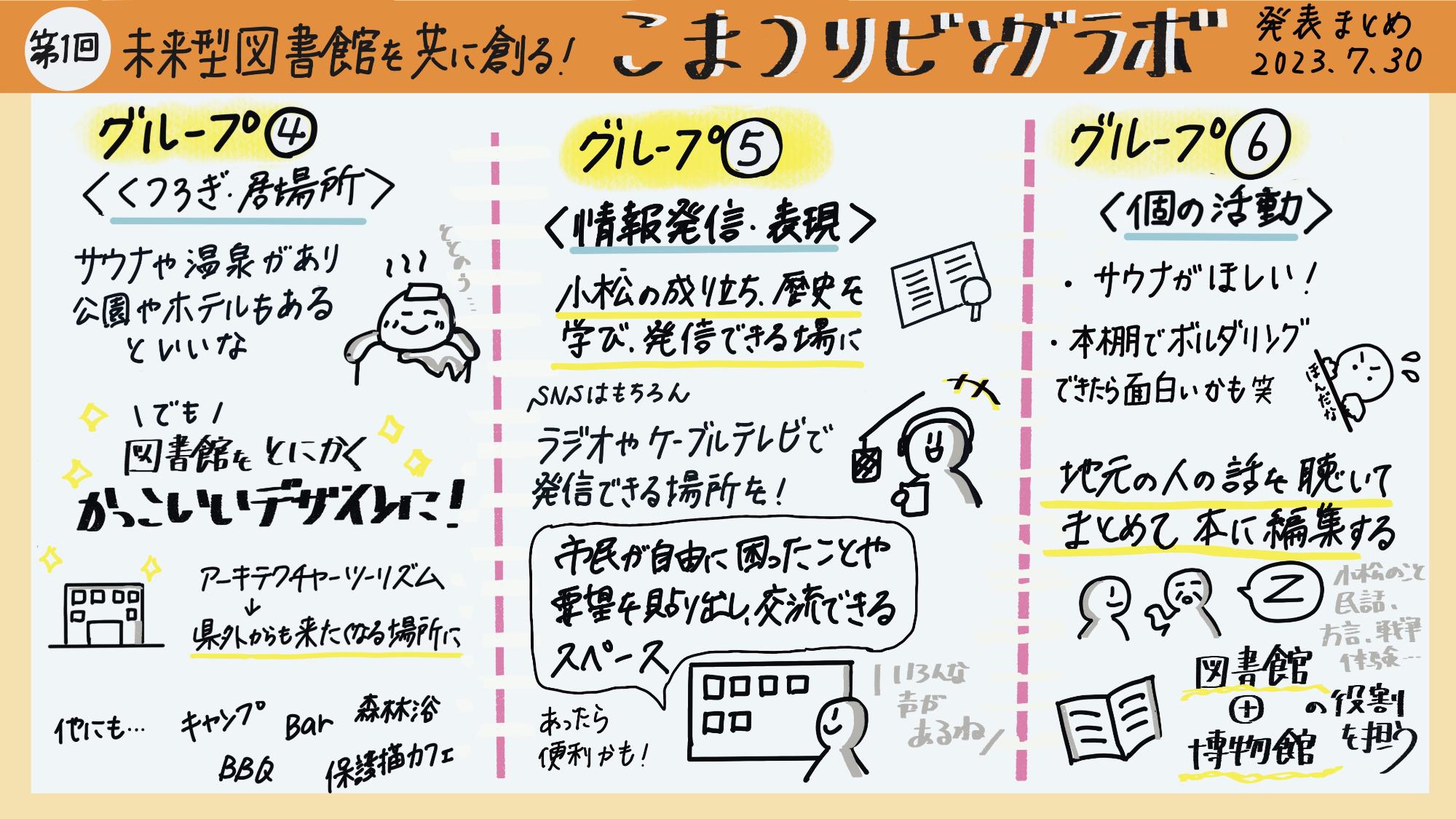 下記の画像は、第2回こまつリビングラボの参加者の方がまとめてくださった「グラフィックレコーディング」です!!