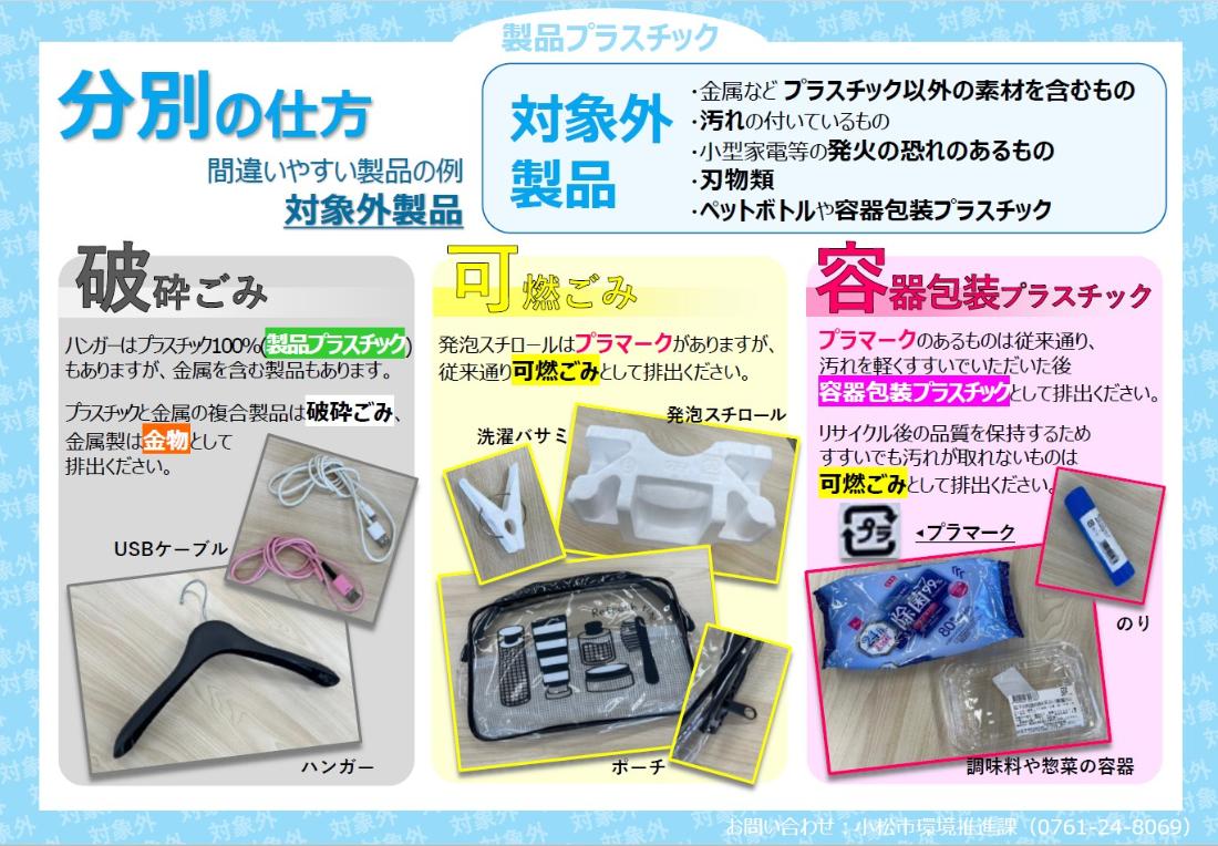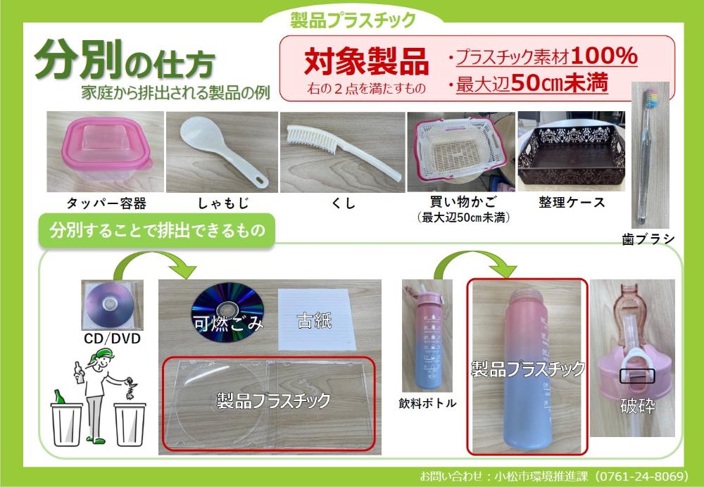 小松市では、ごみ減量化と資源循環の実現を目指し、「プラスチック製品ごみ」の分別収集・再資源化のための課題整理と効果測定を行うため、一部小学校区を対象に、「プラスチック製品ごみ」の試験収集を実施することといたしました。