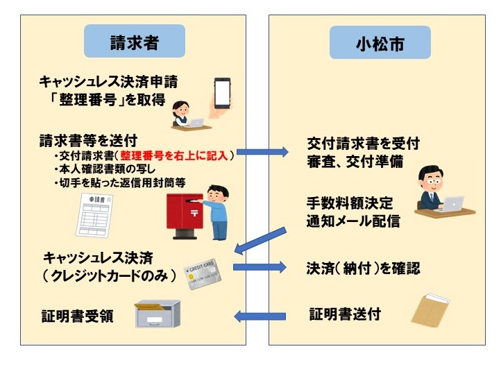 住民票の写しや戸籍証明書等の郵送請求において、手数料をこまつ電子申請サービスを利用したキャッシュレス決済で納付することができます。(クレジットカードのみ)