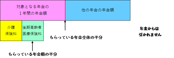 介護保険料と後期高齢者医療保険料の合計が、年金全体の半分以下の場合でも、対象となる年金の年金額の半分を超えるときは年金からのお支払にはなりません。