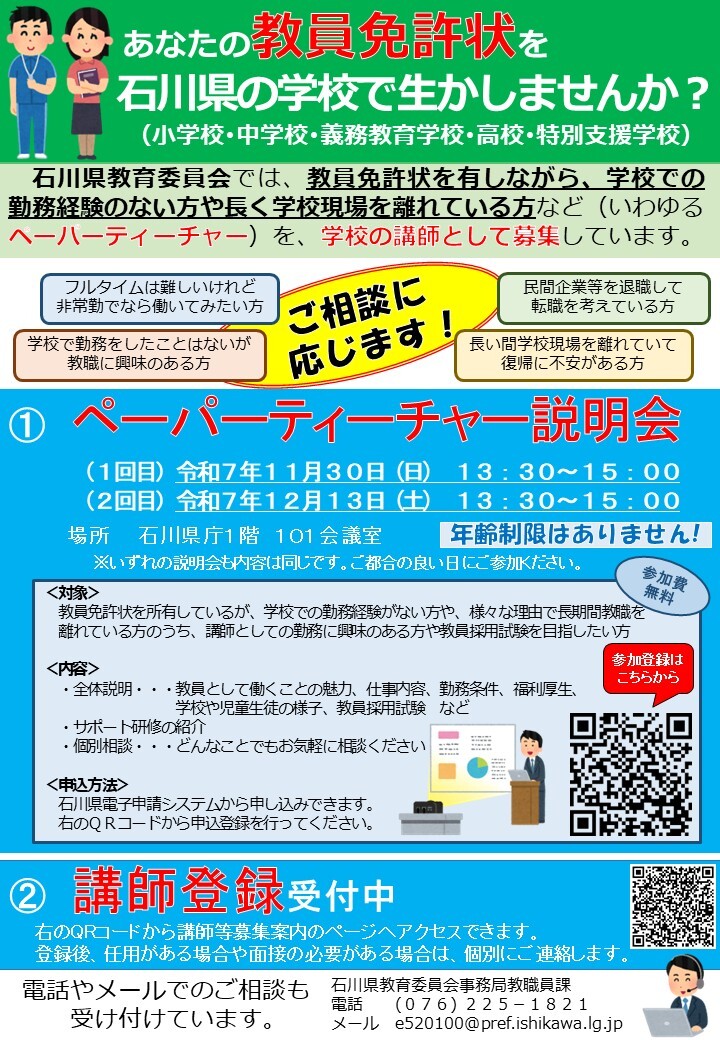 石川県教育委員会では、教員免許状を有しながら学校での勤務経験のない方や学校現場を離れている方(いわゆるペーパーティーチャー)を学校の講師として募集しています。興味関心を持つ方を対象に説明会を開催しています。詳しくは添付資料をご覧ください。
