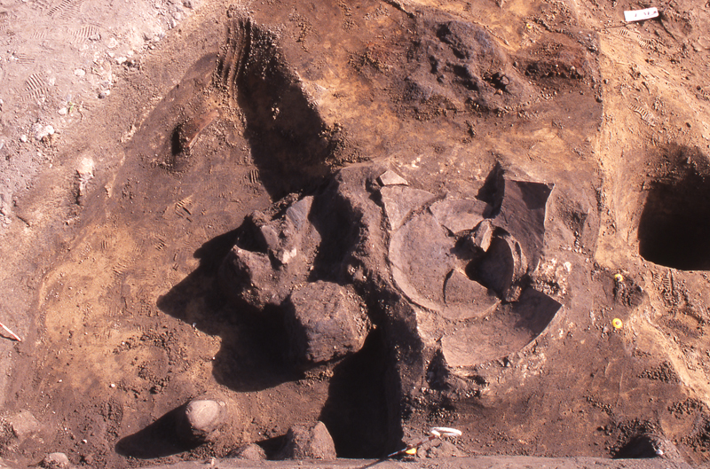 室町時代を中心とする北陸道(北国街道)沿いの町場。付近は文献に登場する有力豪族「本折氏」の拠点と考えられています。調査で見つかったのは、鉄を加工した鍛冶[かじ]のあとや、井戸、廃棄穴などで、鍛冶工房とそこではたらく鍛冶職人の住まいがあったと考えられます。土器や陶磁器、容器や箸などの木製品、砥石や石鉢などの石製品といった生活道具のほか、お茶の文化をしめす天目碗[てんもくわん]や茶入れも出土しました。これらのほか、江戸時代の溝や陶磁器、わずかながら縄文時代や弥生時代、奈良・平安時代の土器片も見つかっています。
